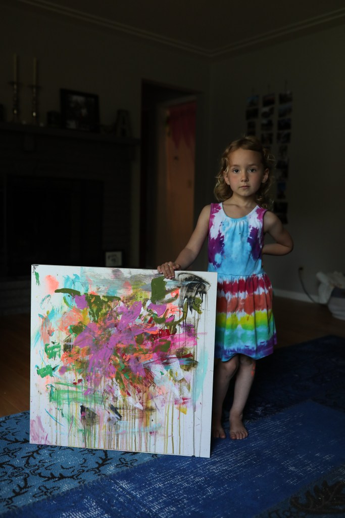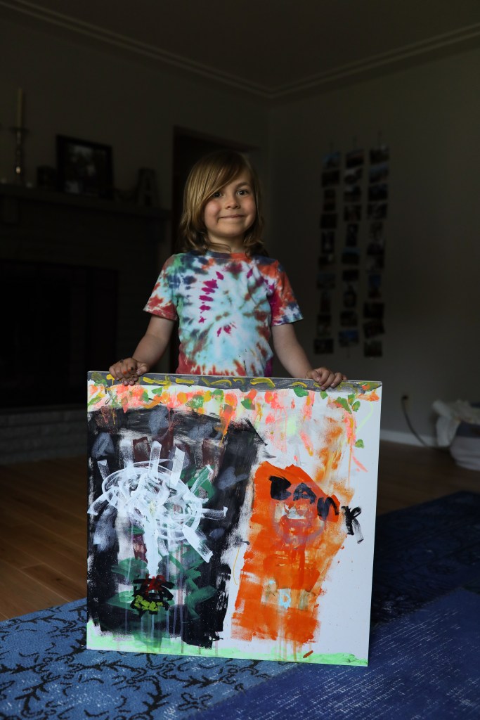 On Sunday I set up a big art project for the kids. I love their school art program so much and it’s been really important to me to keep them creating during this time away from school. I wanted them to have the chance to do a larger, abstract piece, so we looked at some photos and videos of this artist I love and then I set them up on the patio with paints and putty knives and rollers and brushes and a squirt bottle and just let them do their own thing. They probably spent two hours, and when it was all said and done they were so proud. Jonah said to me, “I’m pretty sure I’m going to be an artist when I grow up.”