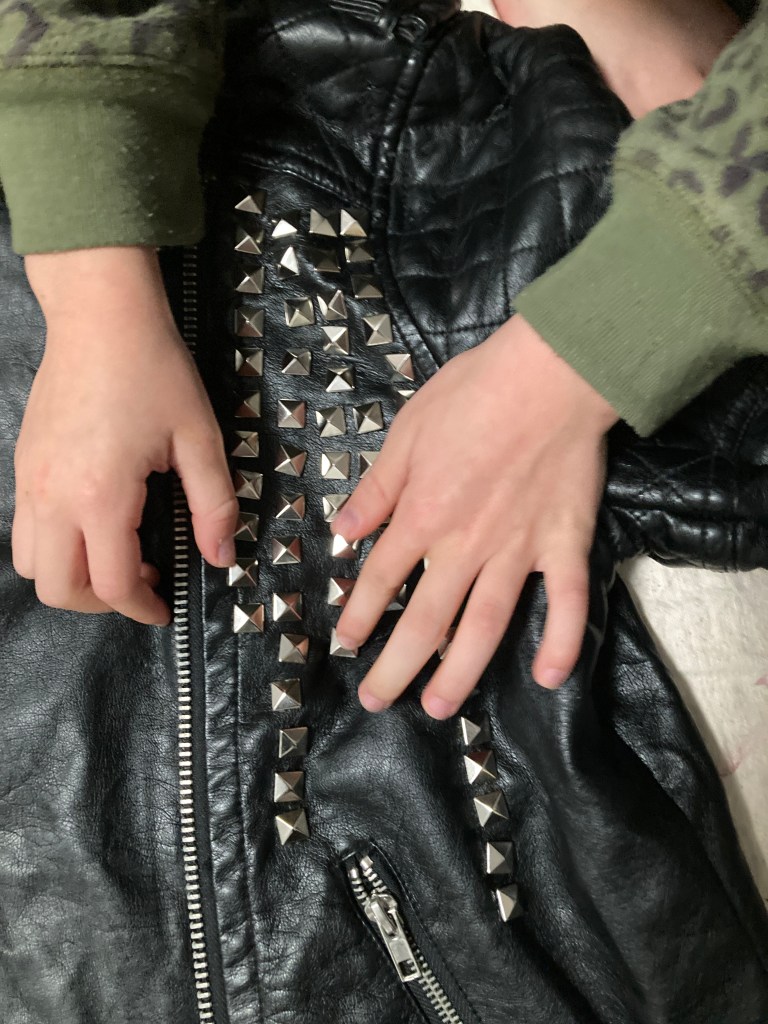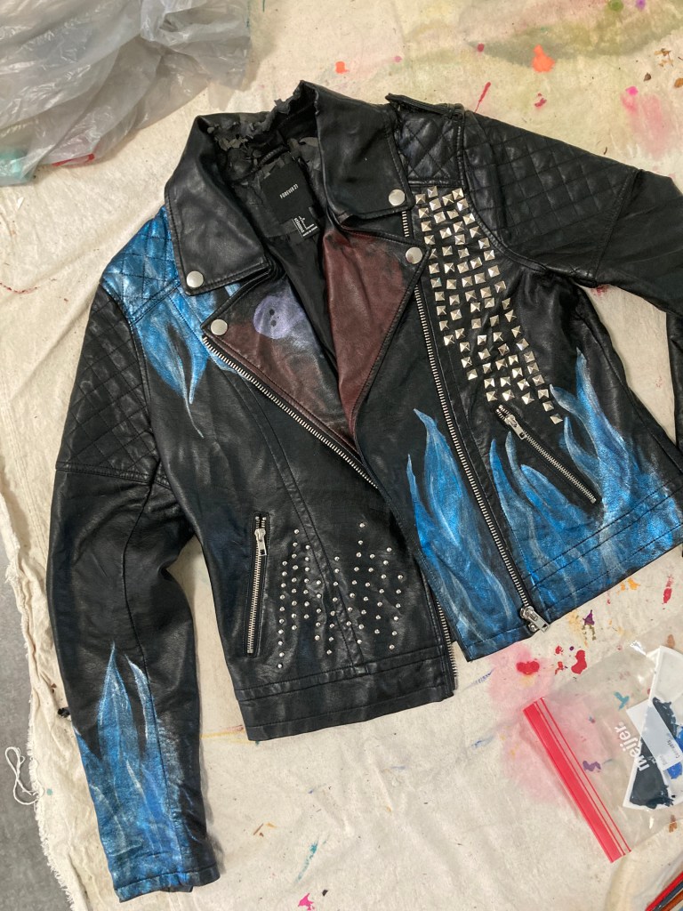 I decided to search thrift stores for faux leather moto gear, and ended up finding two jackets and a vest on Poshmark. All of them were pure black to start. I learned that you can paint faux leather with basic acrylic craft paint and that you can put studs on without any special tools (with only one or two stabbed fingertips in the process). I honestly had SO MUCH FUN making these jackets.